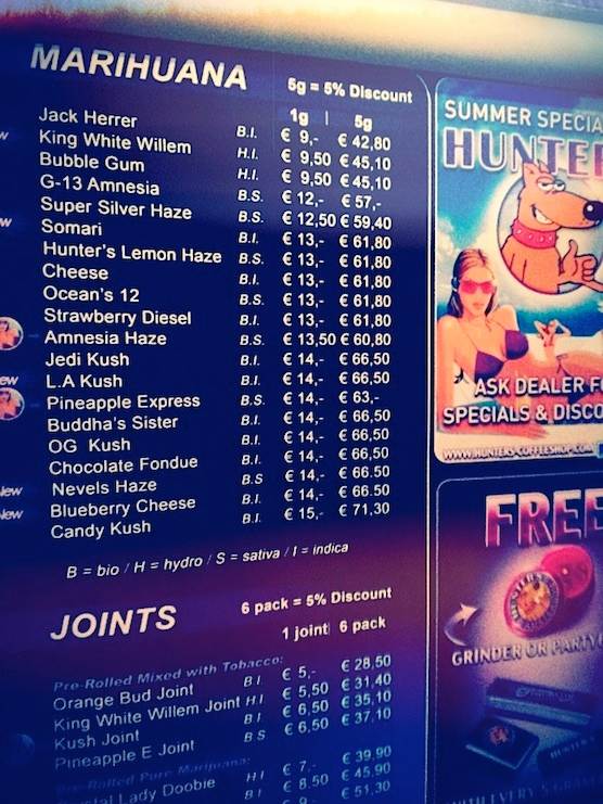 Coffeeshop Hunters offers a big variety of weed, among them are the following types: Jack Herrer, Temple Ball, Afghan, Hunters Special, Nepal Pollen, Super Pollen, Himalya Cream, Sahara, Casa Blanca, Manali Cream, Neville’s Haze Ice, 100% Sativa, G-13, Sensi Star, Bubble Gum, Maaskantje, Amnesia Blaze, and many more. Please find the menu below: